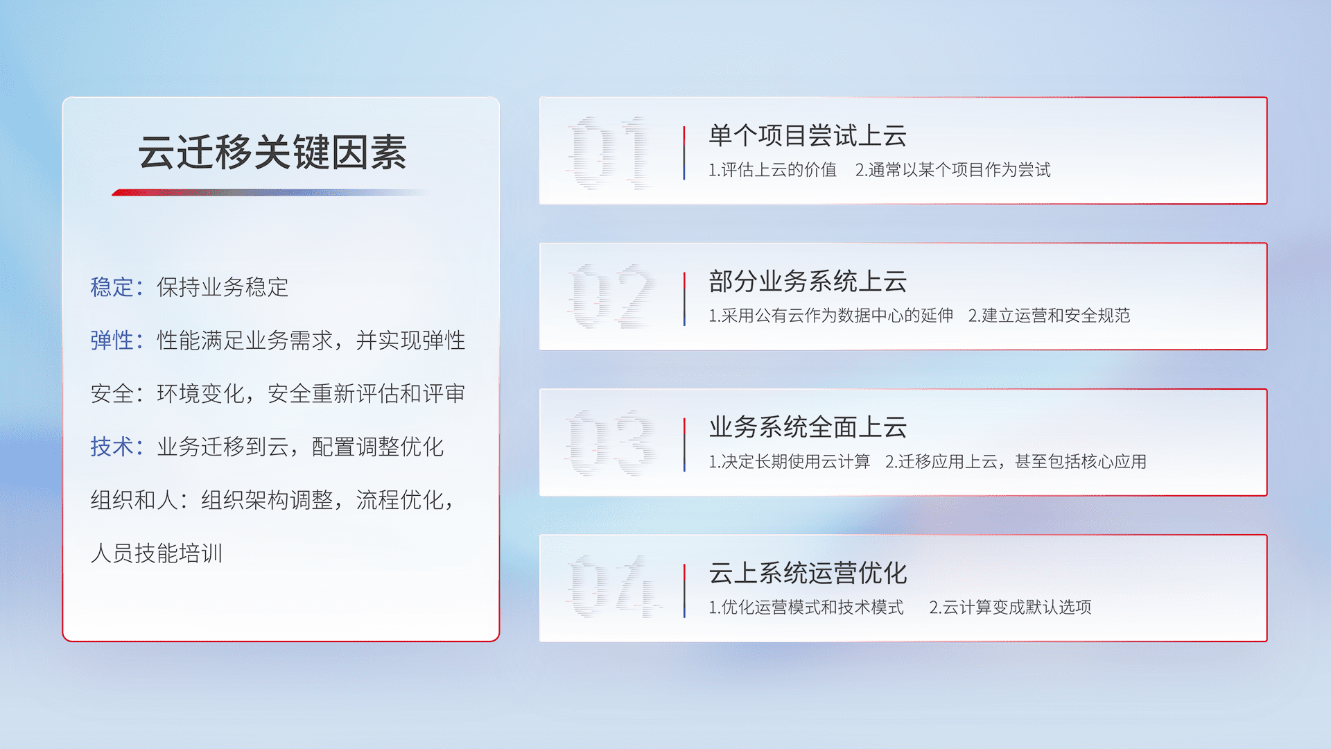 结合实际业务,,,从规划设计、、、云平台选型、、、云原生改造、、、、数据迁移、、、集成交付,,,迁移全过程为客户识别最佳上云路径,,,做好风险识别管理,,,设计网络架构、、、身份权限、、、、安全审计合规、、、操作审计、、日志审计、、、监控告警策略、、、多站点容灾设计等,,,,对云上基础设施进行整体规划,,,提升IT治理水平,,以满足弹性、、、高可用、、、高性能的需求。。。